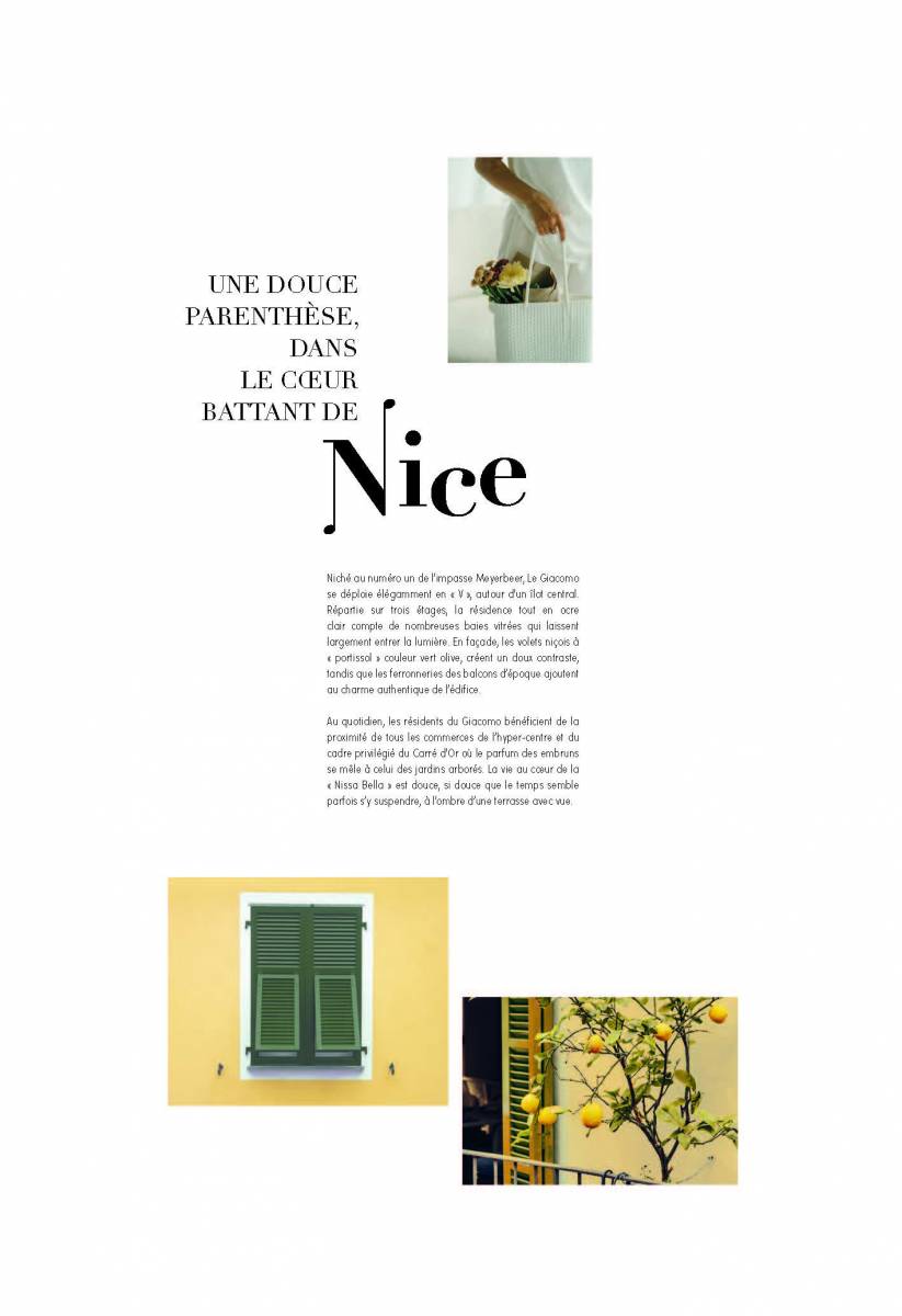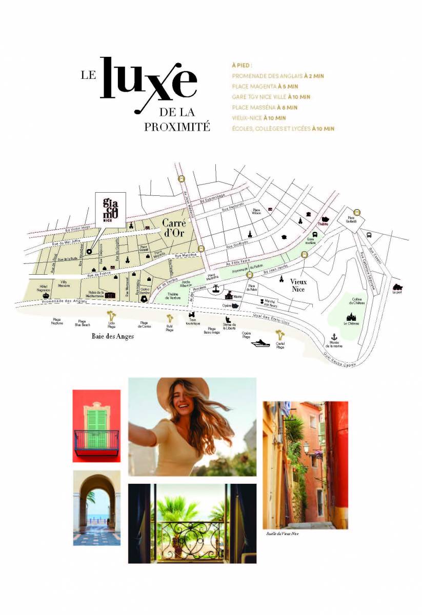 Au quotidien, les résidents du Giacomo bénéficient de la proximité de tous les commerces de l'hyper-centre et du cadre privilégié du Carré d'Or où le parfum des embruns se mêle à celui des jardins arborés. La vie au coeur de la "Nissa Bella" est douce, si douce que le temps semble parfois s'y suspendre, à l'ombre d'une terrasse avec vue.