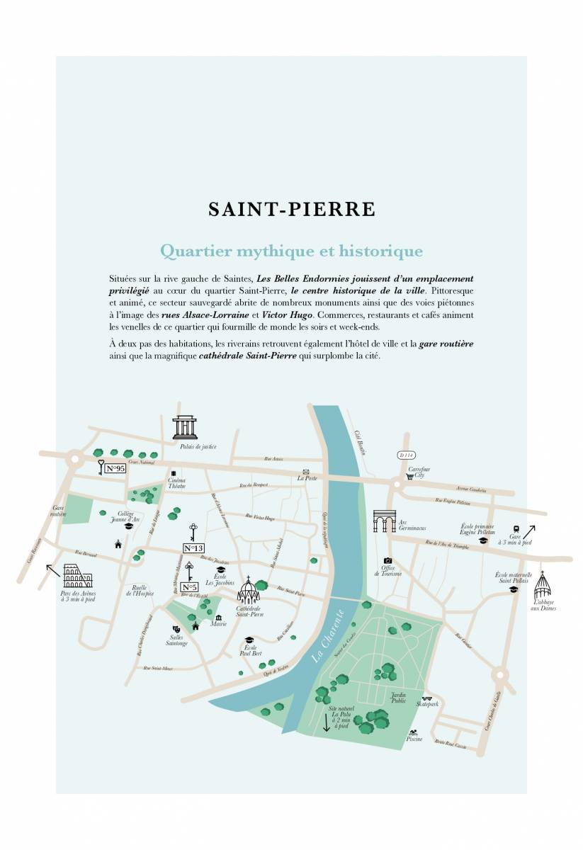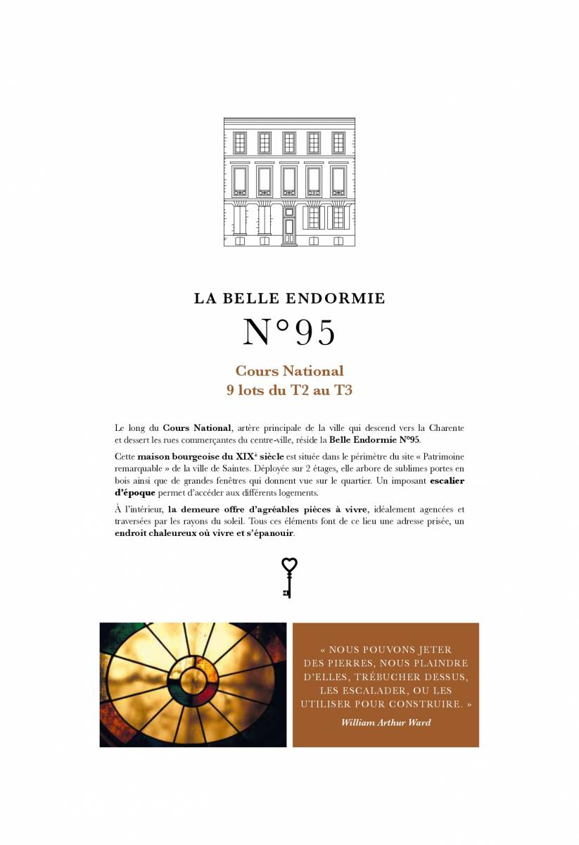 Le long du Cours National, artère principale de la ville qui descend vers la Charente et dessert les rues commerçantes du centre-ville, réside la Belle Endormie N°95 proposant 9 logements du T2 au T5.